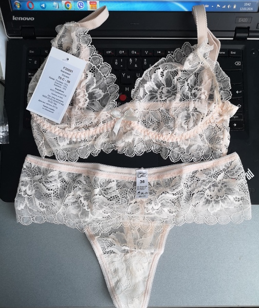 Комплект из бюстье и трусиков стрингов с низкой линией талии. Выполнены из эластичного мягкого кружева. Бюстье - бюстгальтер без косточек и застёжек, одевается как топ, бретели регулируемые, несъёмные.