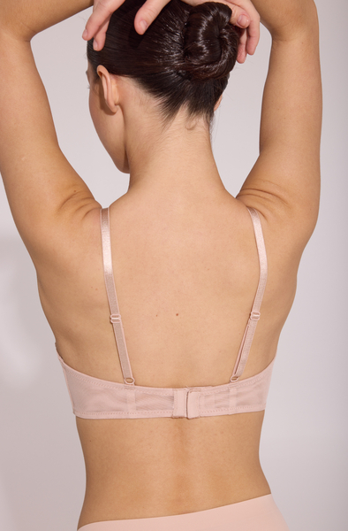 Комфортний напів м'який бюстгальтер з тонкими поролоновими сшитими чашками, що м'яко, але натурально підримує груди. Бюст стильно декорований сіткою у формі майки/топу, що є елементом дизайну та додаткової фіксації. Не має кісточок, але підтримується боковими м’якими пластинами.