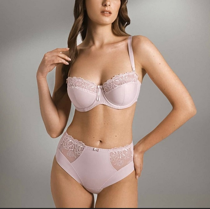 Бюстгалтер "балконет" из неэластичного трикотажного полотна, неэластичной вышивки и эластичного сетчатого полотна, на каркасах. Нижние детали чашек на дубляже с хлопком.