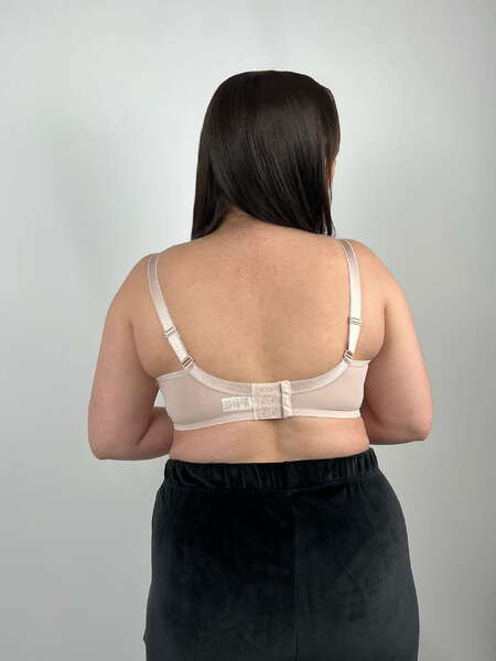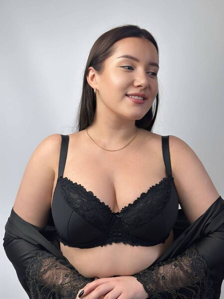 Мереживний бюстгальтер на кісточках. За рахунок т-крою чашки, груди зібрані з боків. підтримка грудей здійснюється за рахунок каркасу. Груди стає більш об'ємним і піднятим. Зовнішня частина чашки та перемичка прикрашена ажурним мереживом із вишуканим квітковим візерунком. Пояс виконаний з посиленої напівпрозорої сітки без бокових кісточок із класичною застібкою на 2 гачки. Бретель незнімний з регулятором довжини.