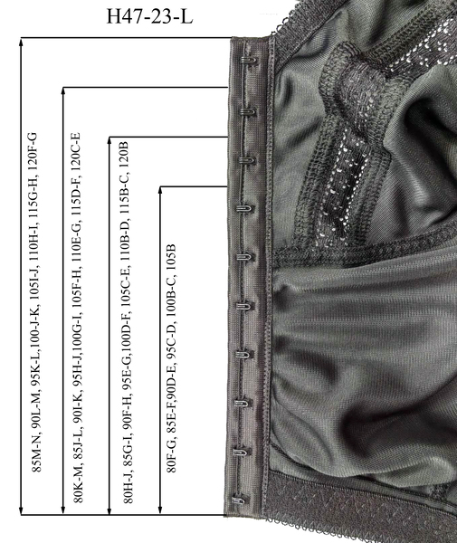 Застібка бюстгальтеру спереду на гачки і петлі в один ряд, висота застібки змінюється в залежності від розміру виробу.