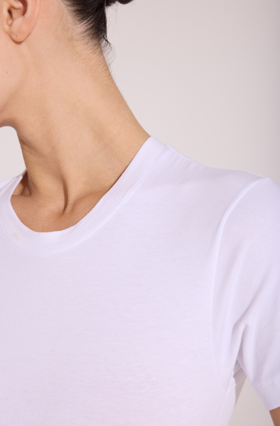 Гладка приталена футболка з високим вирізом під шию витончено підкреслює силует. Лаконічний дизайн робить її універсальною основою для створення багатошарових образів або носіння соло. Тканина поєднує в собі чесану бавовну (combed cotton) та еластан. Спеціальна обробка волокон забезпечує матеріалу виняткову м'якість і тонкість, а щільна структура нитки гарантує міцність та довговічність виробу.