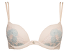 Бюстгальтер Milavitsa арт. 12380 "пуш-ап" с жесткими формованными чашками. Бретели "спагетти". На каркасах. Выполнен из эластичного кружева "биколор" и эластичного кружевного полотна. Отделка – декоративное украшение со стразами, бантики.