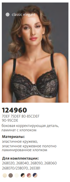 Бюстгальтер с мягкими чашками на каркасах. Выполнен из эластичного трикотажного полотна, кружевного полотна, ламинированного материала и не эластичного кружевного полотна. Чашки с боковой корректирующей деталью и хлопковой подкладкой.