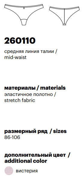 Трусы "танга" из эластичного трикотажного полотна. Средняя линия талии. Отделка - подвеска. Нижние срезы обработаны плоским швом.